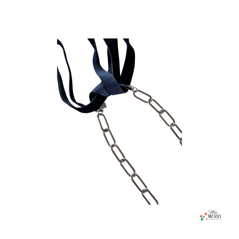 An elegant handmade necklace featuring three freshwater pearls that dangle gracefully from a stainless steel chain. Finished with a long navy blue velvet open-tie ribbon for a soft, romantic touch. A timeless design that blends modern edge with classic charm — perfect for both everyday wear and special occasions.