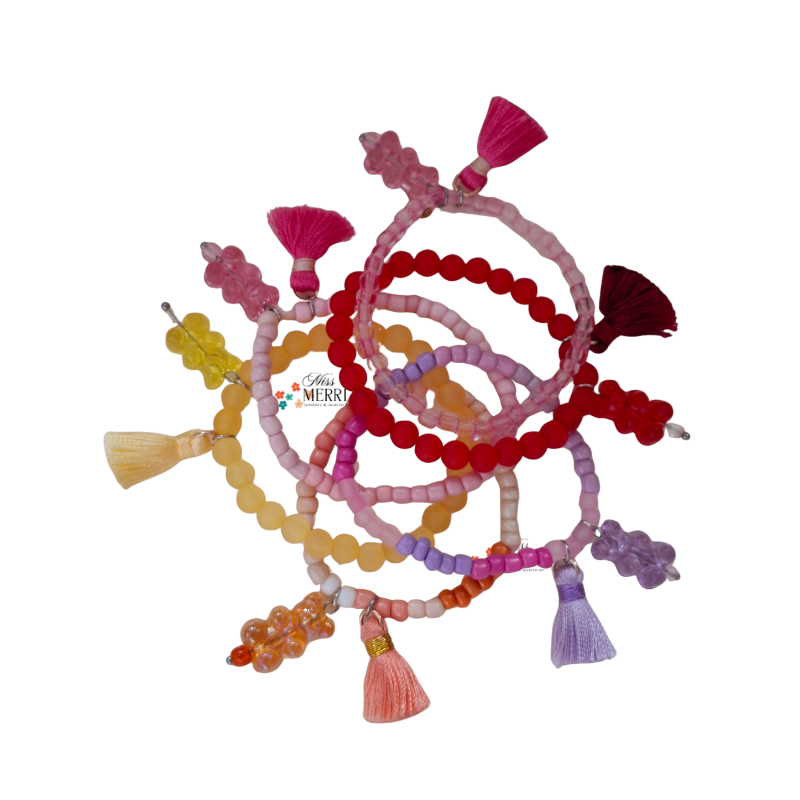 A playful beaded bracelet featuring a rainbow mix of colourful seed beads, accented with a bold red charm and a navy tassel. Hand-strung on a strong elastic cord, this cheerful bracelet is easy to wear and perfect for kids and teens who love vibrant accessories.